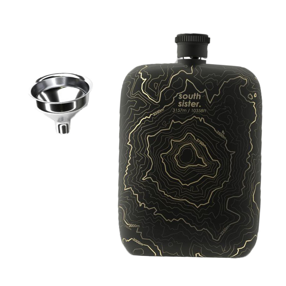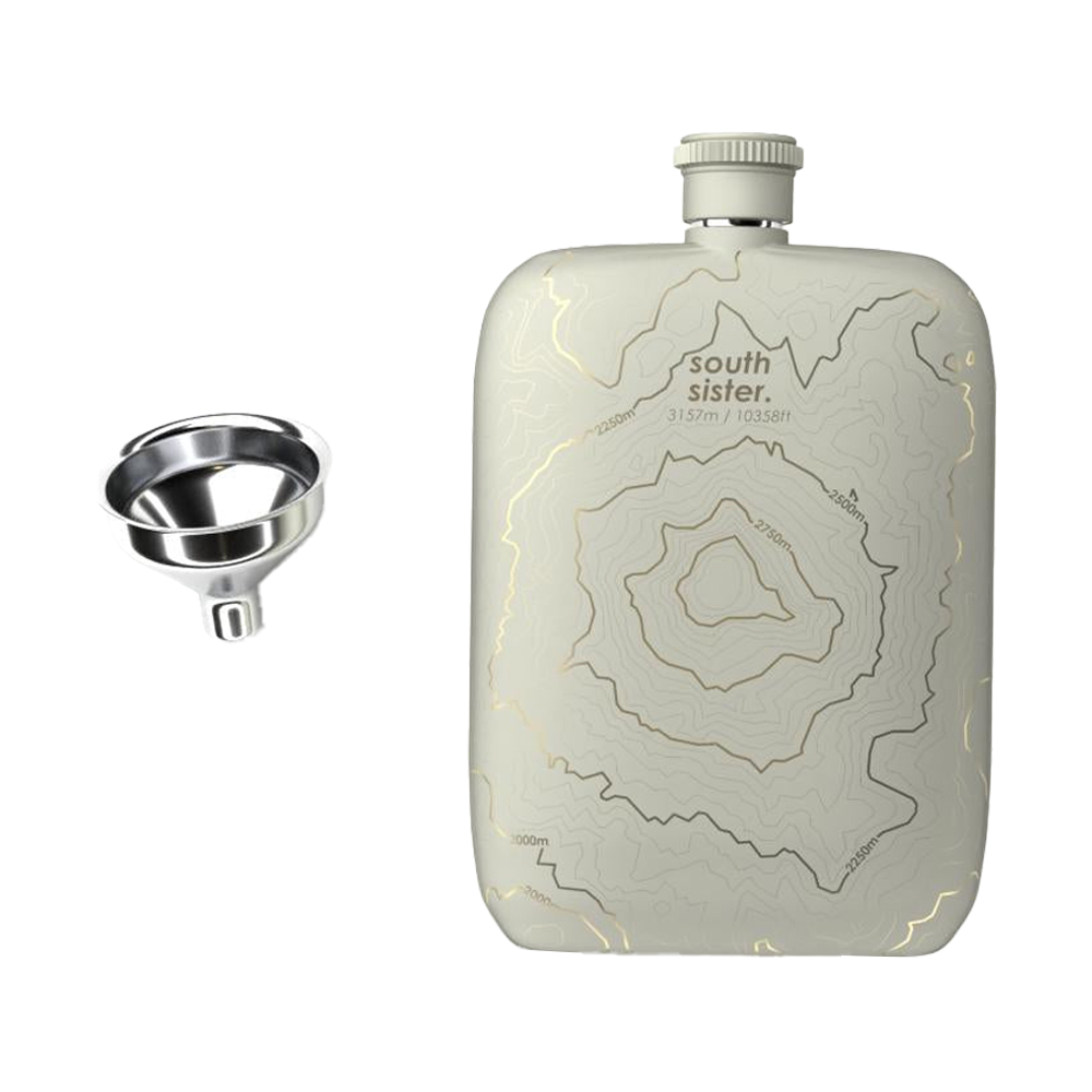 Our flask has a smooth finish and rounded edges that make for a wonderful feel in your hand and a sleek fit in your pocket. Carefully etched with a topographical map of South Sister, this flask makes for a great gift!