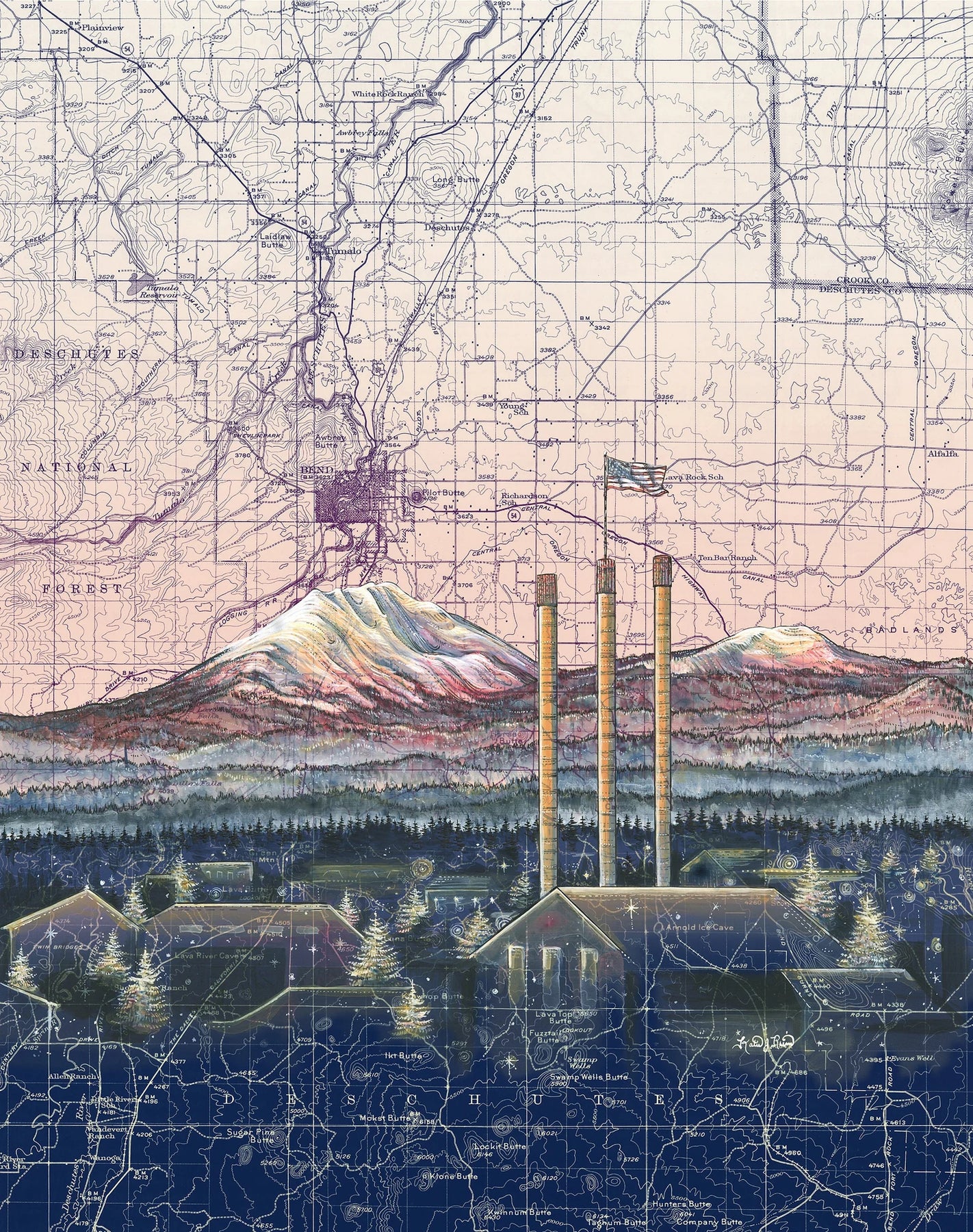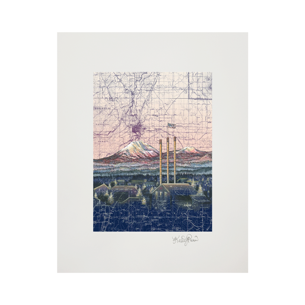 Artist Katie Reim starts each painting by letting the contours of a map lead her toward a composition. She alters the colors of the map to fit the mood of the place, then paints on top with acrylic and finishes the details with meticulous pen and ink. She aims to capture the connection people feel towards their favorite wild places.