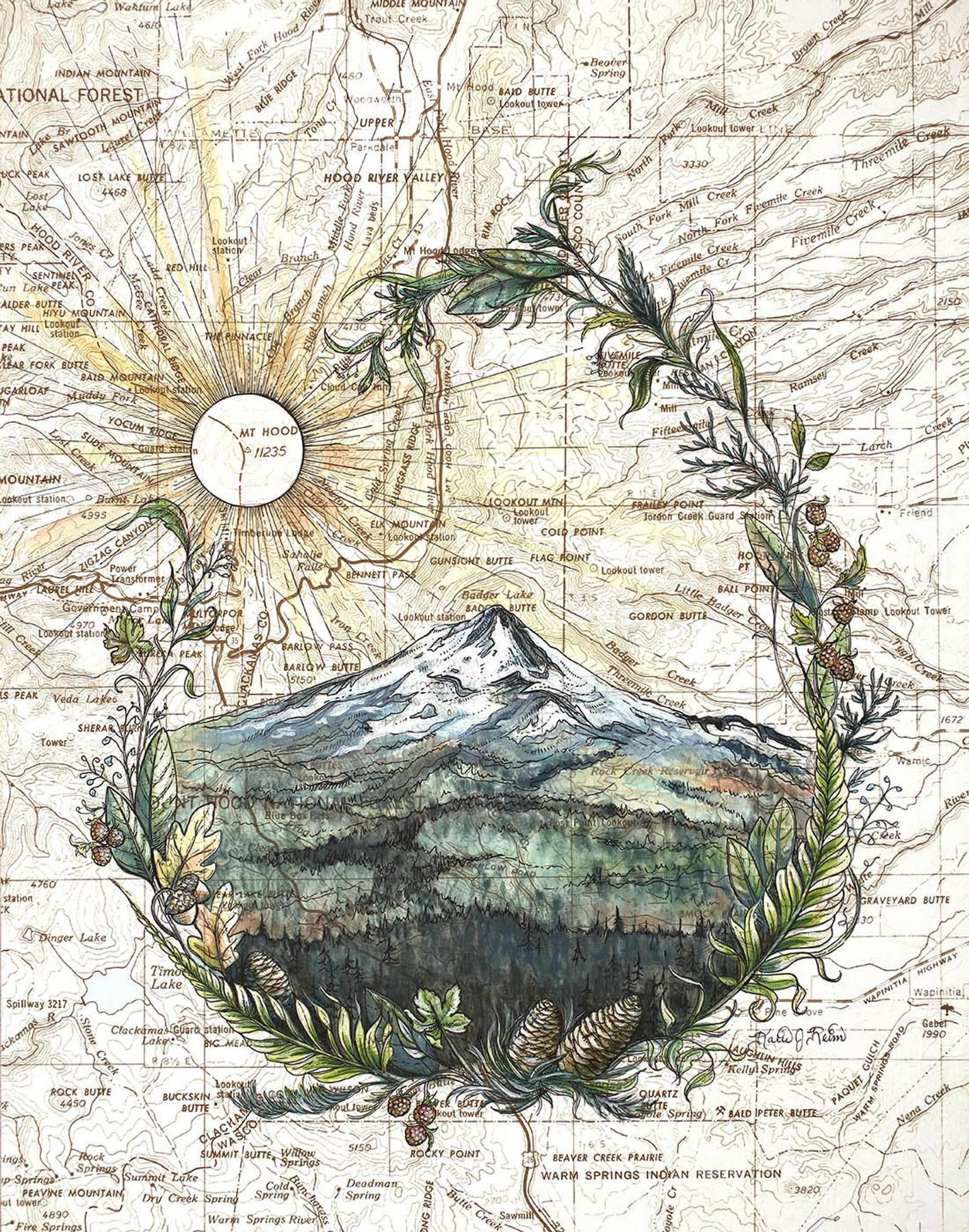 Artist Katie Reim starts each painting by letting the contours of a map lead her towards a composition. She alters the colors of the map to fit the mood of the place, then paints on top with acrylic and finish the details with meticulous pen and ink. She aims to capture the connection people feel towards their favorite wild places.